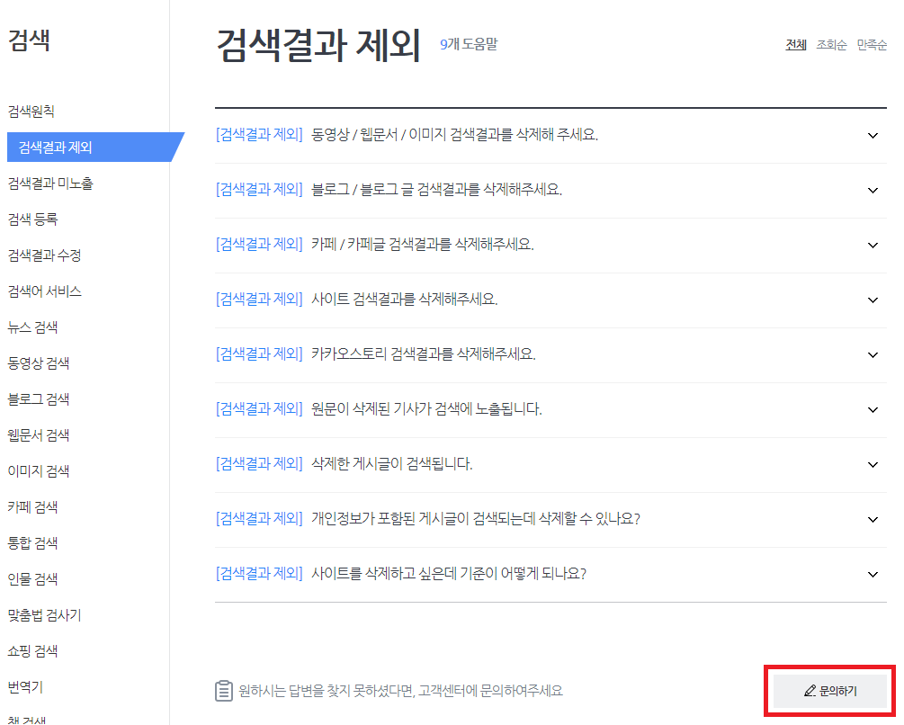 '검색결과 제외' 카테고리를 클릭하면 검색결과 제외한 관련된 자주묻는 질문과 답변이 나오는데요. 사실 우리에게 필요한 건 이게 아니니 쭈욱 내려서 하단을 보시면 '문의하기'가 보입니다. 우리는 '문의하기'를 클릭하시면 되요. 사실 위 과정 상관없이 어떻게든 '문의하기'만 도착하면 되긴 합니다.^^;