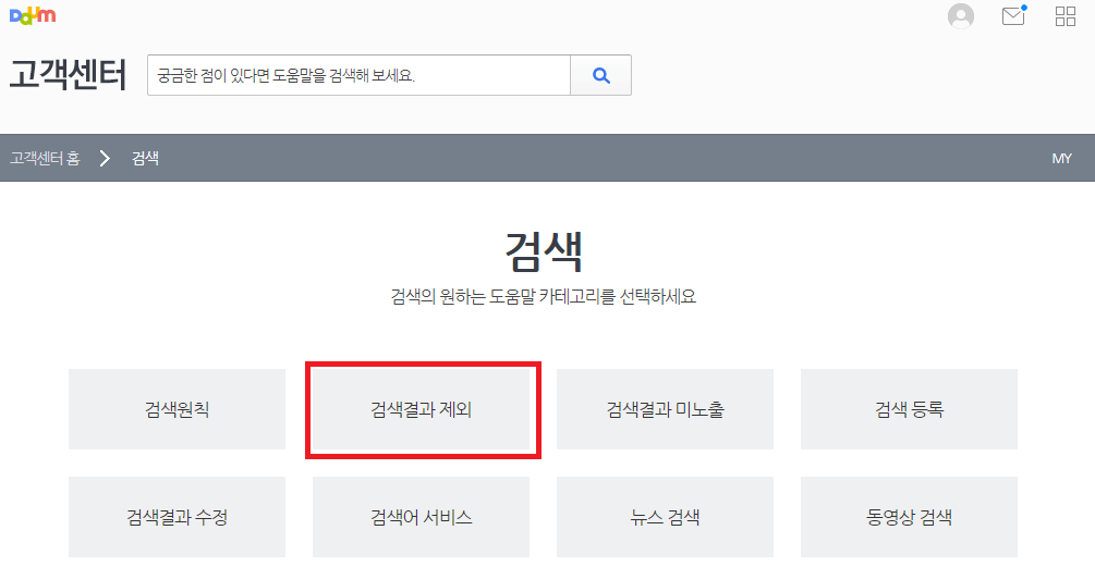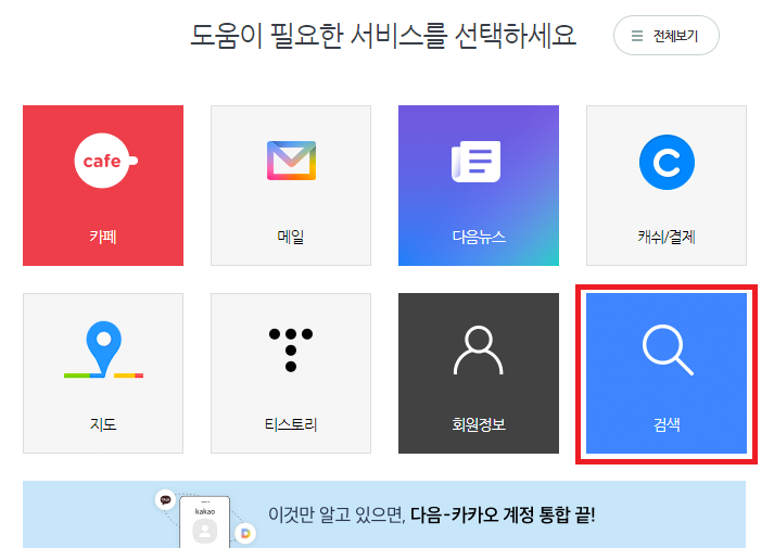 다음에서 '다음 고객센터'를 입력해서 검색하거나, PC 다음 하단의 '고객센터'를 클릭해서 '검색'을 클릭합니다.