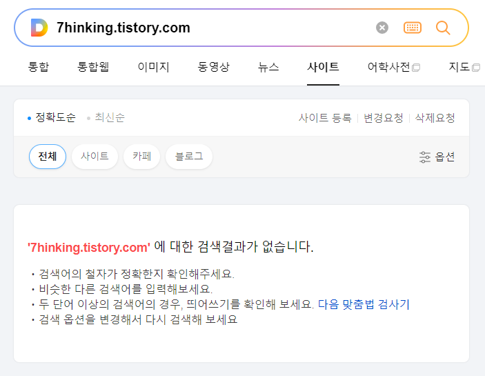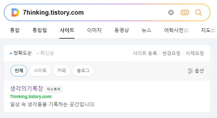 티스토리 블로그가 다음 저품질에 걸렸는지 가장 쉽게 확인하는 방법은 PC와 모바일앱에서 다음에 접속하여 본인의 티스토리 주소를 검색해 보는 방법인데요. 예를들어 제 블로그 주소인 7hinking.tistory.com을 검색했을 때 이상이 없으면 아래와 같이 사이트 카테고리에서 정상적으로 티스토리 블로그가 사이트로 보이는데요.
