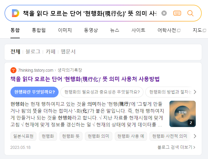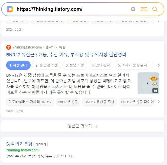 그래서 저는 일단 제가 포스팅한 글 150여개 정도를 '설정 - 글목록'에 들어가서 제목을 복사하여 일일이 다음 검색창에 검색을 해보았는데요. 제목들을 일일이 검색을 하다 보니 거의 대부분의 글들은 아래와 같이 다음에서 검색이 되었습니다.