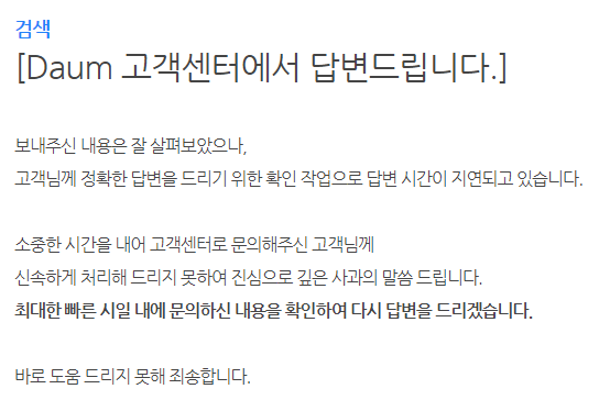 저 문의를 오전 10시 30분경에 남겼었는데요. 그러고 30분 후 쯤 문의남긴 고객들이 기다릴 것을 생각해서인지, 다음 고객센터에서 정확한 답변을 드리기 위한 확인 작업으로 답변 시간이 지연된다고 하며, 최대한 빠른 시일내에 답변을 주겠다는 첫 번째 답변글이 올라왔습니다.