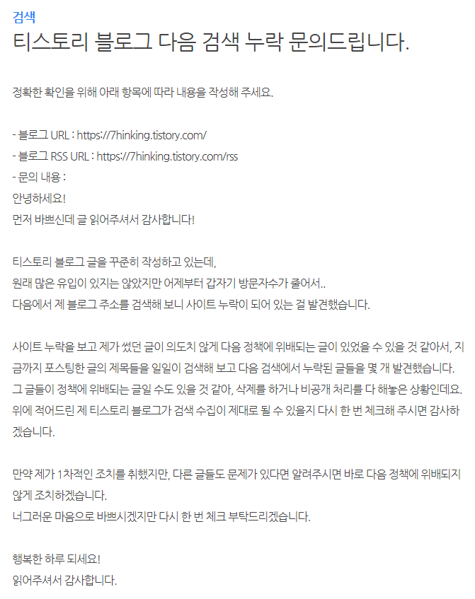 다음에서 티스토리 블로그 주소를 검색하니 사이트 카테고리에 검색결과가 나오지 않는 걸 발견하고, 의도치 않게 다음 정책에 위배된 글을 적었을지 해서 관련 있을만한 글들을 삭제 및 비공개 처리했다고 하며, 다시 한 번 제 티스토리 블로그를 체크해 주었으면 좋겠다고 정중히 문의를 남겨봤습니다.