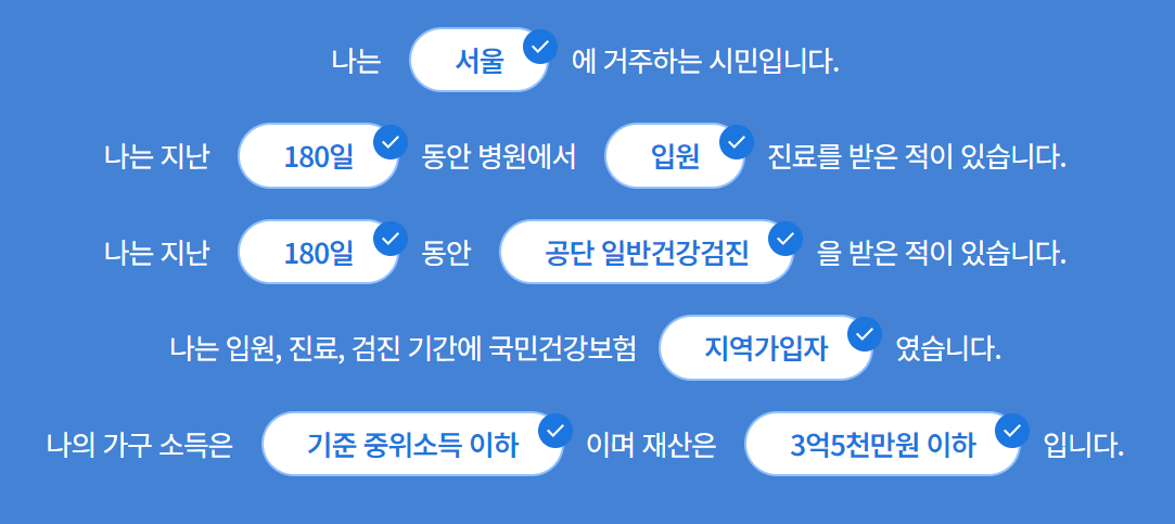 지원 대상은 입원 및 입원 연계 외래진료 또는 국가 일반건강검진을 실시하고, 기준 중위소득 100% 이하의 소득 기준과 3억 5천만 원 이하(토지, 건축물, 주택, 임차보증금 등 일반재산액)의 재산 기준을 모두 충족하는 서울시민 중 국민건강보험 지역가입자인 경우입니다.