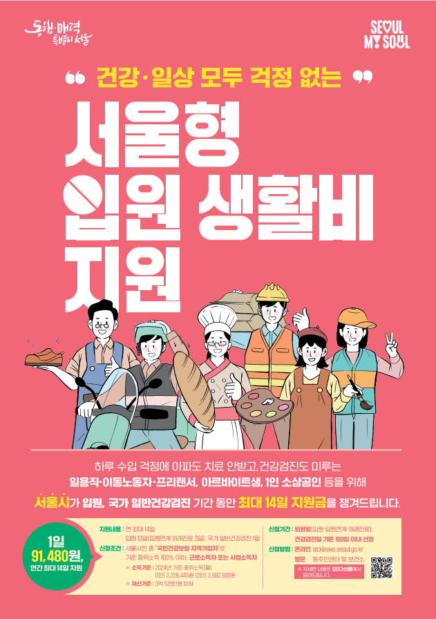 서울형 입원 생활비 지원제도는 하루 수입 걱정에 아파도 치료를 받지 않거나 건강검진을 미루는 일용직·특수고용·프리랜서, 아르바이트생, 1인 소상공인 등을 위해 입원(입원연계 외래진료), 국가 일반건강검진 기간 동안 1일 9만1480원, 연 최대 14일까지 입원 생활비를 지원하는 사업입니다.