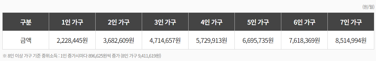 2024년 기준 중위소득 100%는 대략적으로 1인가구 222만원, 2인가구 368만원, 3인가구 471만원, 4인가구 572만원, 5인가구 559만원, 6인가구 761만원, 7인가구 851만원 입니다.