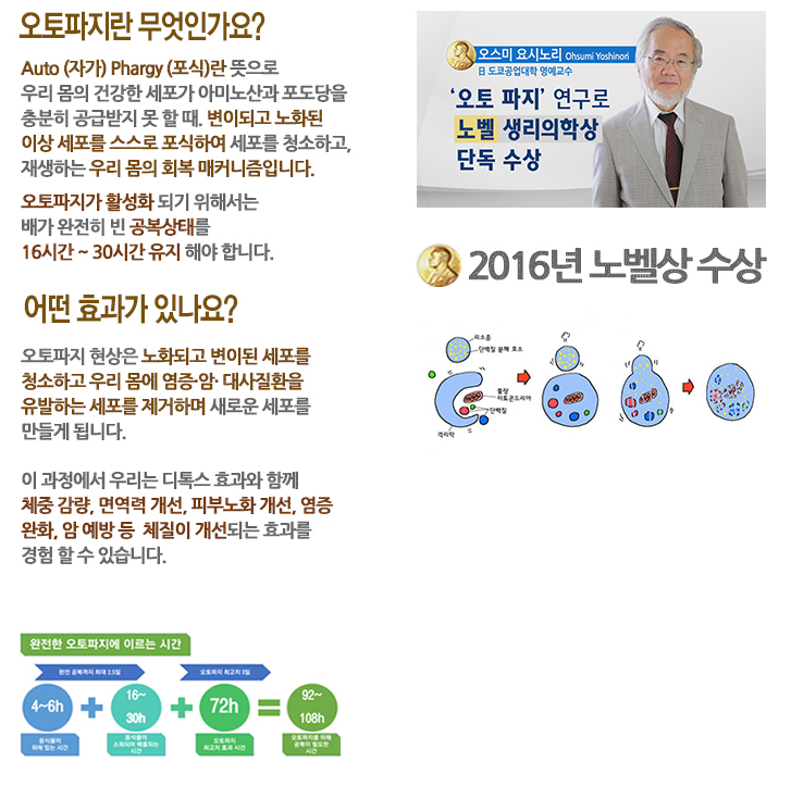 오토파지란 Auto(자가) Phargy(포식)란 뜻으로 우리 몸의 건강한 세포가 아미노산과 포도당을 충분히 공급받지 못 할 때, 변이되고 노화된 이상 세포를 스스로 포식하여 세포를 청소하고, 재생하는 우리 몸의 회복 매커니즘을 의미한다고 합니다.