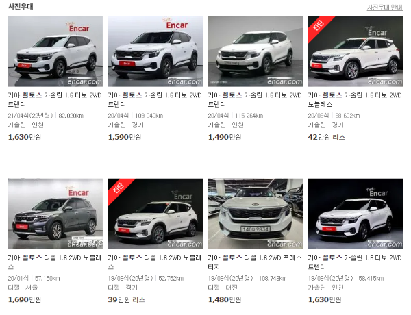 그 중에서 셀토스가 예산안에서 구매할 수 있는 가장 최신형이고 크기도 적당해 셀토스를 목표로 중고차 플랫폼들을 검색하기 시작했는데요. 그런데 알고보니 셀토스는 중고차 시장의 인기 모델이고, 평균 판매가가 2300~2400만 원이더라구요. 제가 봤던 일부 차들은 사고가 났던 과거가 있어서 가격이 평균 가격보다 많이 낮았던거였던거죠.