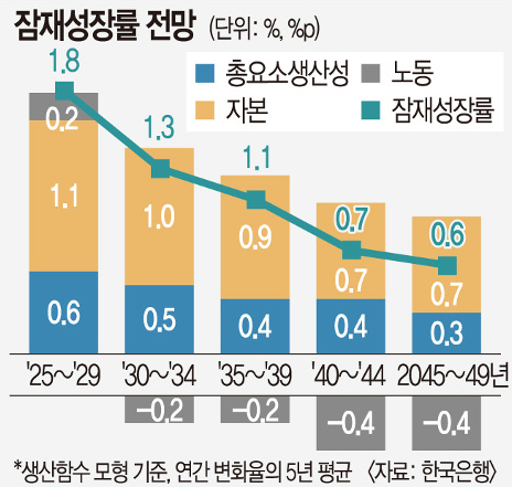 한국의 잠재성장률은 과거 산업화 시기에는 7~8% 수준으로 매우 높았습니다. 하지만 저출산·고령화와 생산성 둔화 등으로 인해 최근에는 2%대에 머무렀는데요. 거기에 최근 저출생·고령화와 수도권 집중 등 우리 경제의 구조적 문제를 해결하지 못하면 15년 후 잠재성장률이 0%대로 떨어질 수 있다는 경고까지 나왔죠. 이는 한국 경제가 더 이상 고속 성장이 아닌 안정적인 성장을 추구해야 하는 시기에 접어들었음을 의미합니다.