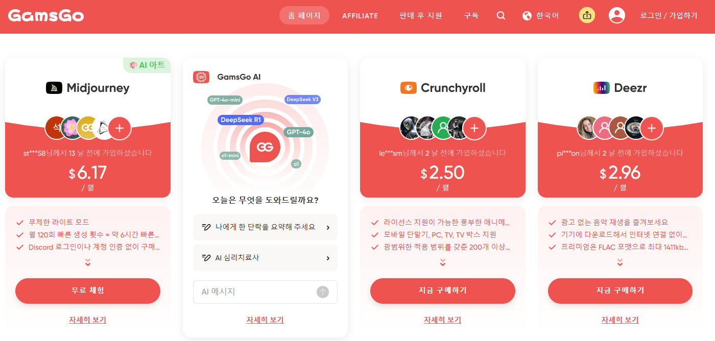 겜스고는 국가별 요금 차이와 합리적인 패밀리 플랜 구성으로 한국보다 훨씬 저렴한 가격에 미드저니 유료 플랜을 제공합니다.
