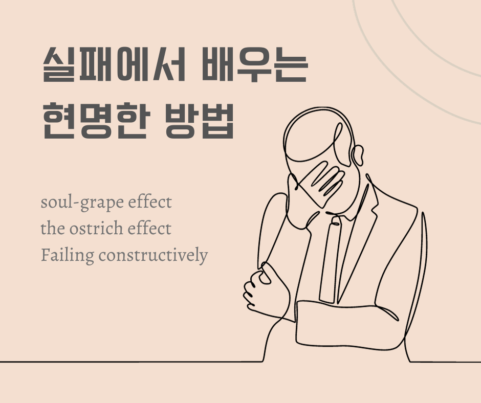 우리는 도전을 해서 실패를 하게 되면 오히려 실패한 과제에 대해 평가절하할 방법을 찾는데, 이것은 우리가 인내하고 목표에 도달할 동기에 덜할지도 모른다는 것을 의미하며, 이 현상은 ‘신 포도 효과(sour-grape effect)’로 알려져 있습니다. 또는 우리는 실패를 한 것을 모르거나 실패의 이유에서 자신의 잘못을 깨닫지 못하고 아무 일도 없었던 것처럼 살아가기도 합니다. 이것은 미래에 더 나은 성과 혹은 지금보다 나를 향상시키기 위한 더 나은 방법을 배우는 것을 방해하는 것들입니다.