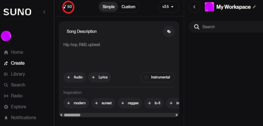 가장 기본적인 방법입니다. 만들고 싶은 음악의 분위기, 장르, 주제 등을 간단한 문장으로 입력하고 'Create' 버튼만 누르면 됩니다.