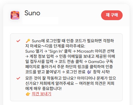 ■ 간편한 이용 : 겜스고 사이트에서 SUNO AI 상품을 선택하고 결제하면 바로 이용 가능한 계정 정보를 받아볼 수 있어 과정이 매우 간단합니다.
