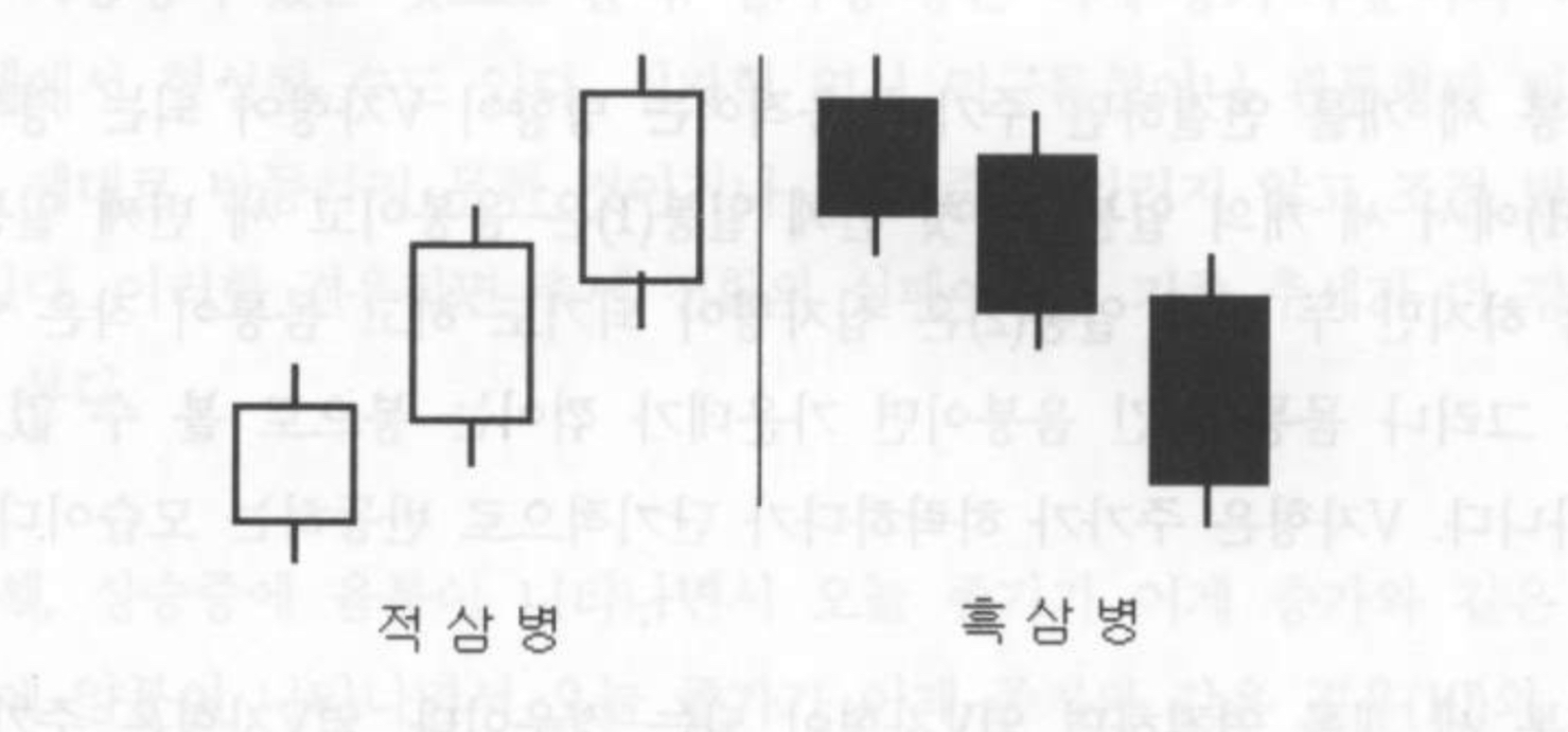 적삼병이란 양봉이 3개가 연속 출현하면서 주가가 상승하는 경우이고, 흑삼병은 음봉이 3개가 연속 출현하면서 주가가 하락하는 경우입니다. 적삼병이나 흑삼병과 같이 같은 봉이 3개 나란히 나타난다는 것은 같은 방향으로 움직이는 주가의 힘이 강한 것입니다. 적삼병이나 흑삼병에는 봉의 길이가 길수록 추세의 힘이 강한 것으로, 위 차트처럼 봉 몸통의 길이가 점점 길어지면 추세의 힘이 강하다는 의미로 신뢰성이 크지만, 3개 봉의 몸통 길이가 점점 짧아지면 추세의 힘이 상대적으로 약해진다는 의미로 신뢰성이 떨어집니다.