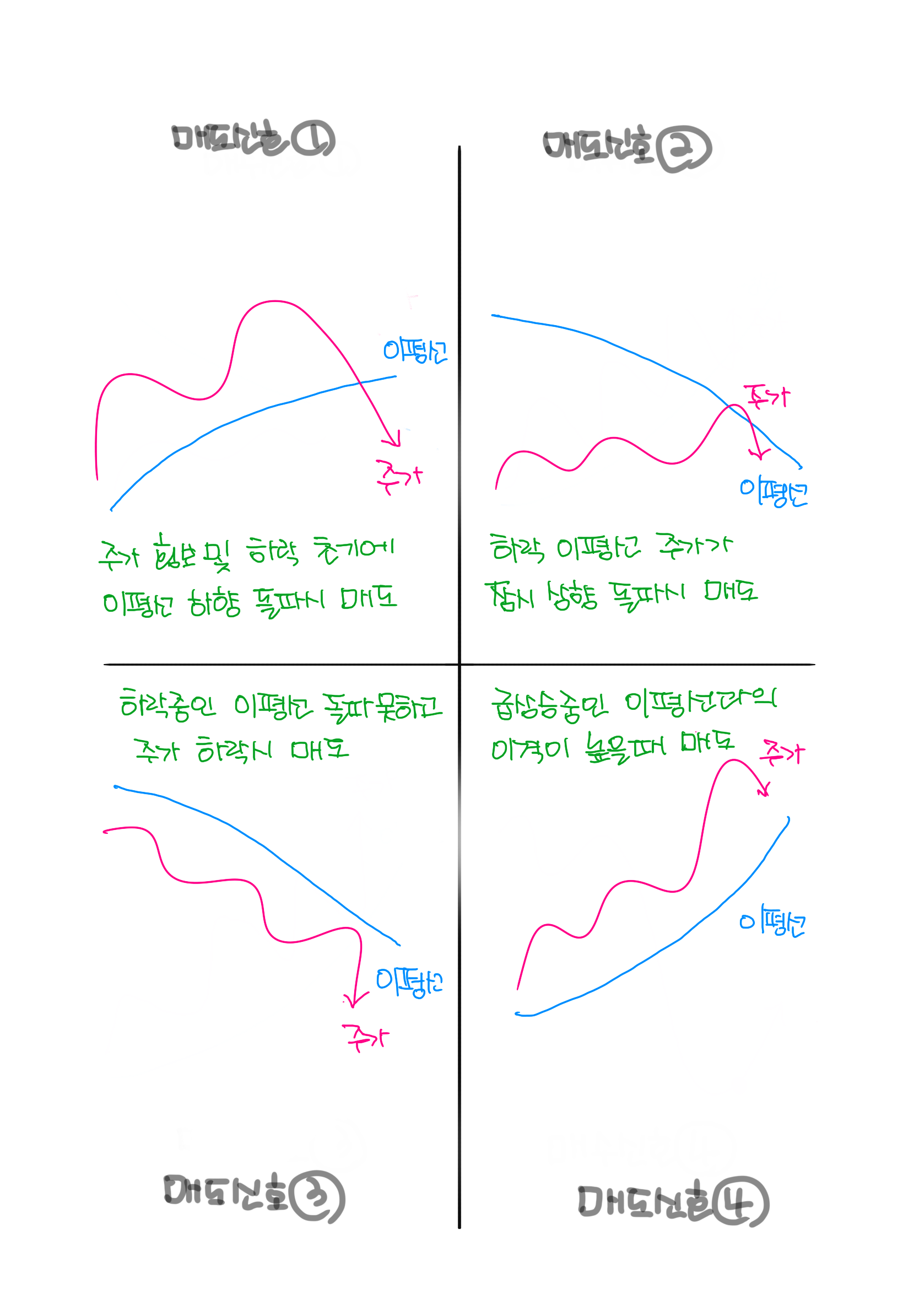 그랜빌의 4가지 매도 신호는 위에서 본 4가지 매수 신호의 패턴을 뒤집에 놓은 것입니다. 참고로 차트를 볼 때 추세 분석이 어려운 경우 차트를 뒤집에서 보고 뒤집힌 모양에서 판단되는 추세와 반대로 판단하는 것도 도움이 된다고 합니다.